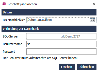 Geben Sie anschließend ein administratives Login in Form von Benutzername und Kennwort für den genutzten SQL-Server an und bestätigen Sie den Vorgang mit einem Klick auf die Schaltfläche “Löschen”.