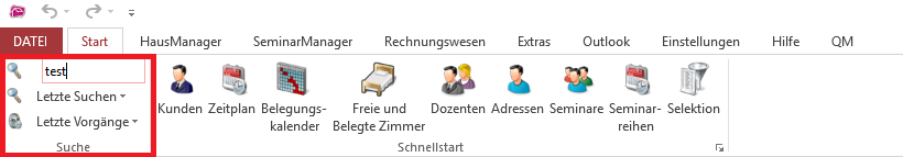 Die Schnellsuche ist im Startbereich des Haus-/ und Seminarmanagers zu finden, in der oberen linken Ecke ist das freie Suchfeld der Schnellsuche. Die Suche können Sie nach Eingabe des benötigten Stichworts durch drücken der Enter-Taste starten. Außerdem werden sowohl die Letzten Suchen, als auch die Letzten Vorgänge angezeigt.