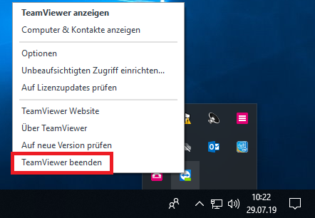 Nun wählen Sie das TeamViewer Symbol per Rechtsklick aus und klicken dort auf TeamViewer beenden.