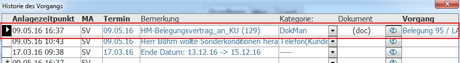 In der Historie des Kunden und der Belegung erscheint nun ein Eintrag mit der Verknüpfung.
