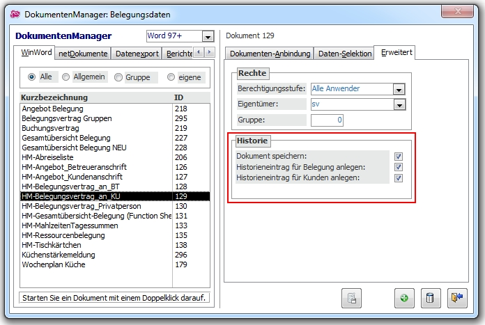 Im DokumentenManager lässt sich für jedes einzelne Dokument bestimmen, ob es beim Öffnen automatisch in der Historie abgelegt werden soll oder nicht. Öffnen Sie dazu den DokumentenManager, markieren Sie ein Dokument in der Liste unter „Kurzbezeichnung“ und klicken Sie im rechten Bereich auf „Erweitert“. Dort finden Sie die Einstellungen für die Historie.