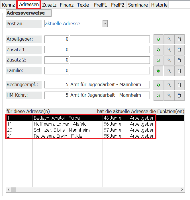 Ebenfalls können innerhalb einer Adresse zugeordnete Adressen in die Selektion gestellt werden. Möchten Sie beispielsweise alle oder bestimmte Arbeitnehmer eines Arbeitsgebers selektieren, gehen Sie wie folgt vor: