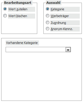 Der Schalter „Kennzeichen zuteilen“ ermöglicht Ihnen, in einem Schritt allen Adressen eine Kategorie oder einen Werbeträger zuzuteilen. Wählen Sie dazu unter „Auswahl“ den Bereich, den Sie bearbeiten möchten und anschließend den entsprechenden Eintrag aus der Auswahlbox aus. Unter „Bearbeitungsart“ legen Sie fest, ob dieser Eintrag bei den selektierten Adressen gesetzt oder entfernt werden soll. Klicken Sie dann auf „Bearbeitung durchführen“.