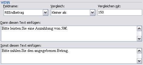 Unter „Feldname“ wird das Seriendruckfeld „REEndbetrag“ ausgewählt, da in dem Feld der Gesamtbetrag steht. Ist dieser Betrag kleiner als („Vergleich: Kleiner als“) 150 („Vergleichen mit: 150“), dann soll der Text eingefügt werden, den ich unter „Dann diesen Text einfügen:“ hinterlege. Außerdem kann auch ein Text hinterlegt werden, der angezeigt wird, wenn die Bedingung nicht zutrifft („Sonst diesen Text einfügen:“).