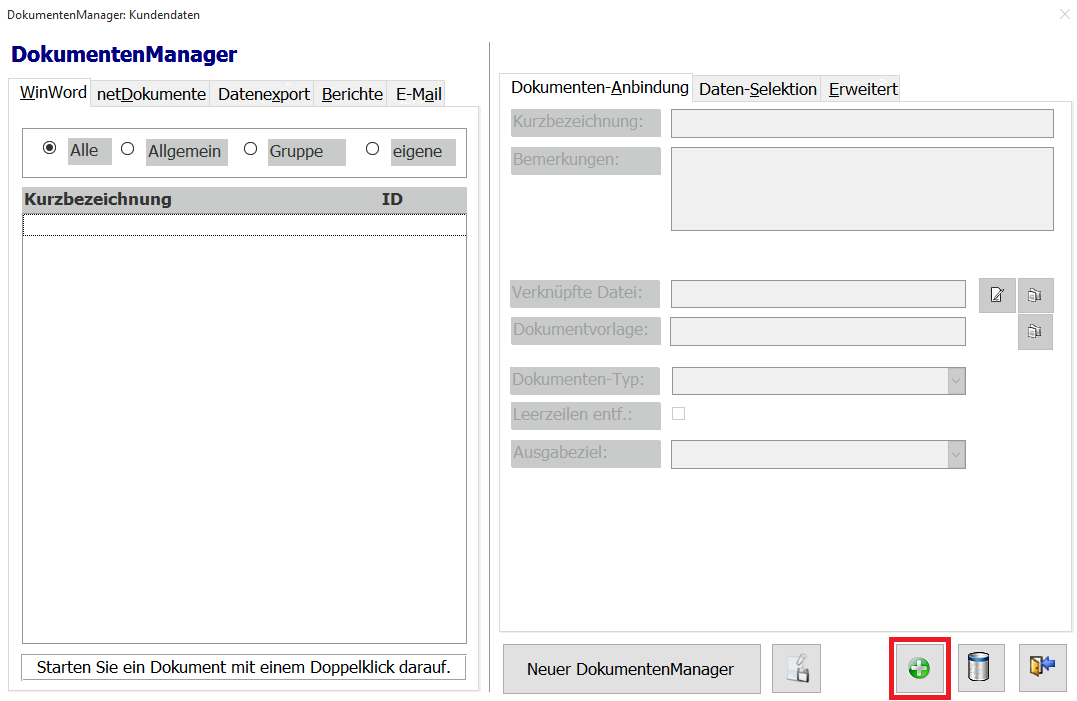 In der linken Hälfte der Maske finden Sie eine Auflistung aller Dokumente, die bereits an den HausManager angebunden sind. Diese erscheinen unter „Kurzbezeichnung“. Die Liste ist in obigem Abbild noch nicht gefüllt. Daher werden wir im nächsten Schritt ein Dokument anlegen.