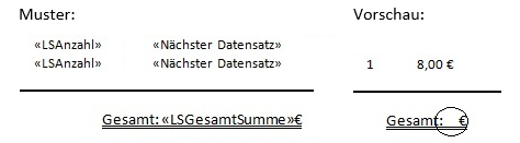 Wenn nun unterhalb der Liste weitere Seriendruckfelder eingefügt werden, ist es möglich, dass diese in der Vorschau kein Ergebnis liefern. Im unten stehenden Beispiel gibt das Seriendruckfeld <LSGesamtSumme> beispielsweise kein Ergebnis zurück.