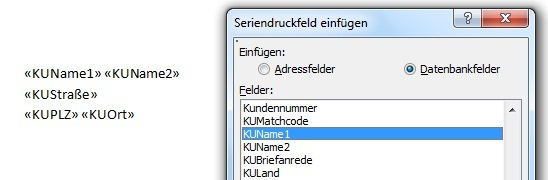 Des Weiteren ist wichtig, ein Seriendruckfeld immer als ein Zeichen zu betrachten. Das bedeutet, dass ein Feld nur als Ganzes eingefügt und wieder gelöscht werden darf. Es soll z.B. die Kundenadresse im Worddokument platziert werden. Dazu sind die Felder KUName1, KUName2, KUStraße, KUPLZ sowie KUOrt notwendig.