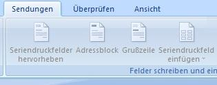 In Word stehen Ihnen nun spezielle Funktionen zur Verfügung. Wechseln Sie auf den Karteireiter „Sendungen“ (Office 2007). Dort finden Sie den Punkt „Seriendruckfeld einfügen“.