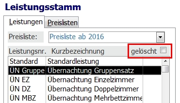 Der Vorteil ist u. a. der, dass eine gelöschte Leistung einfach wiederhergestellt werden kann. Klicken Sie oberhalb der Liste links auf den Haken „gelöscht“, um alle gelöschten Leistungen wieder einzublenden. Je Leistung ist im rechten Bereich (unter der Sortiernummer) ein Haken „Global gelöscht“ zu finden. Entfernen Sie diesen Haken, um die Leistung wiederherzustellen.