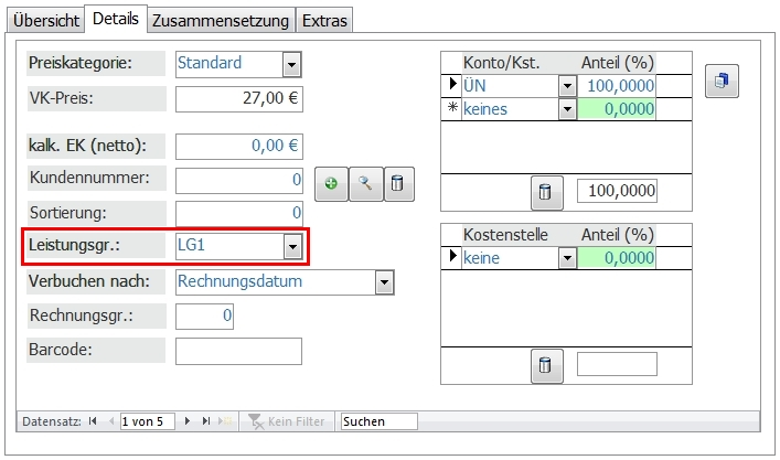 Danach muss der Leistungsstamm evtl. neu aufgerufen werden, damit die Änderungen gespeichert sind. Anschließend kann über die Karteikarte „Details“ bei der entsprechenden Leistungen die Leistungsgruppe hinterlegt werden.