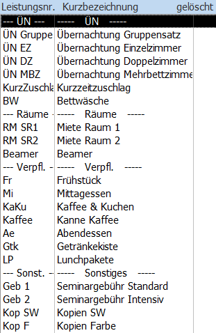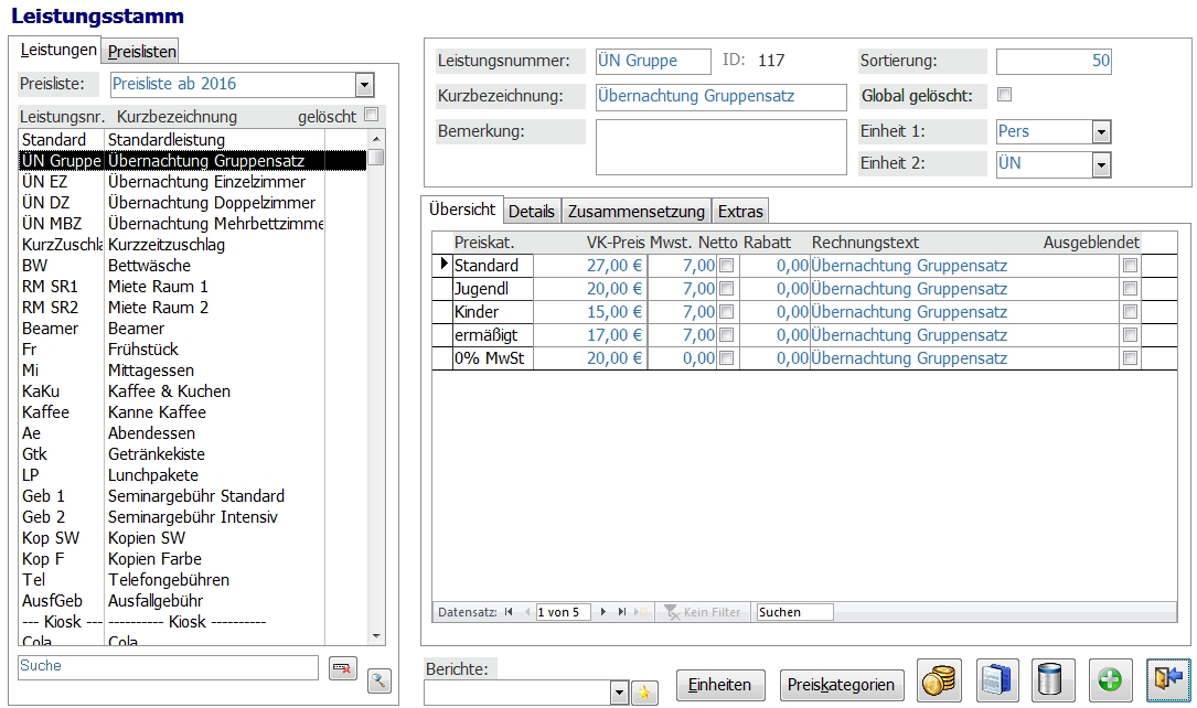 Alle Leistungen, die Sie ihren Kunden in Rechnung stellen möchten, müssen zunächst im Programm hinterlegt werden. Das können z. B. Übernachtungspreise, Mahlzeiten, Kopien, Gebühren, Raummieten usw. sein. Jede Einrichtung bietet seinen Kunden unterschiedlichste Leistungen an. Die Preisstruktur kann von verschiedenen Faktoren abhängen. So kann der Preis oder auch der Mehrwertsteuersatz für ein Frühstück abhängig von der Altersstruktur (Kinder, Jugendliche, Erwachsene) oder von einer Mitgliedschaft (kirchliche Gruppe, nichtkirchliche Gruppe, vhs, …) sein.