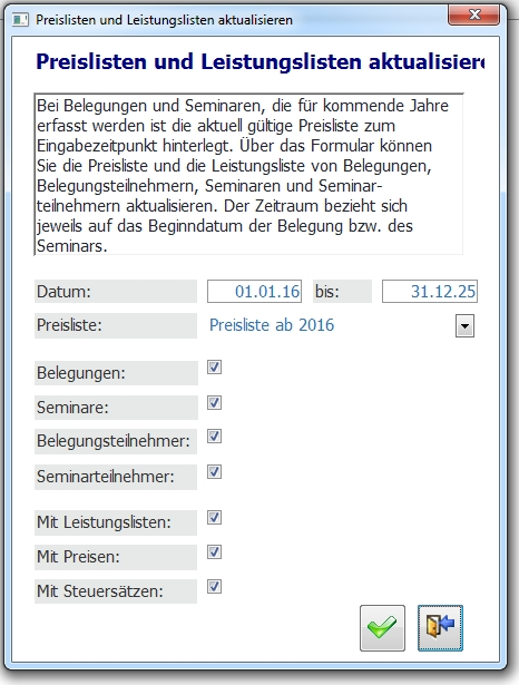 Hierbei ergibt sich ein Problem, das an folgendem Beispiel deutlich wird: Sie geben die Preisliste für das kommende Jahr im September diesen Jahres in den Leistungsstamm des Haus- und SeminarManagers ein. Zu diesem Zeitpunkt ist Ihr Haus für nächstes Jahr aber bereits so gut wie ausgebucht. Alle bereits eingegebenen Belegungen und Leistungslisten wurden mit der alten Preisliste und den alten Preisen hinterlegt. Belegungen, die künftig eingegeben werden, greifen zwar automatisch auf die neue Preisliste zurück – aber was geschieht mit den anderen Belegungen, die schon im System sind?