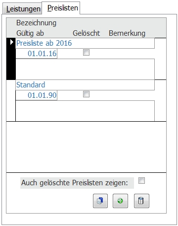 Die Leistungen selbst sind in allen Preislisten gleich. Daher fällt auf den ersten Blick nicht auf, welche Preisliste gerade bearbeitet wird. Eine Leistung wird bei Löschung aus allen Preislisten gelöscht bzw. ausgeblendet!