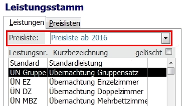 Sobald sich Ihre Preise ändern, können die neuen Preise im Leistungsstamm hinterlegt werden. Allerdings sollten die aktuellen Preise nicht einfach überschrieben werden. Schließlich werden die aktuellen Preise noch benötigt, bis die neue Preisliste aktiv wird. Aus diesem Grund gibt es im Leistungsstamm des Haus- und SeminarManagers die Preislisten. Sie finden die Preislisten unter dem gleichnamigen Reiter oben links.