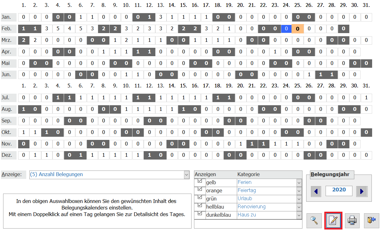 Öffnen Sie dafür zuerst den Belegungskalender unter „HausManager“ > „Belegungskalender“. Dort finden sie auf der rechten unteren Seite die Möglichkeit, Kalendermemos und Kategorien einzurichten. Klicken Sie hierfür auf das im Screenshot rot markierte Symbol.