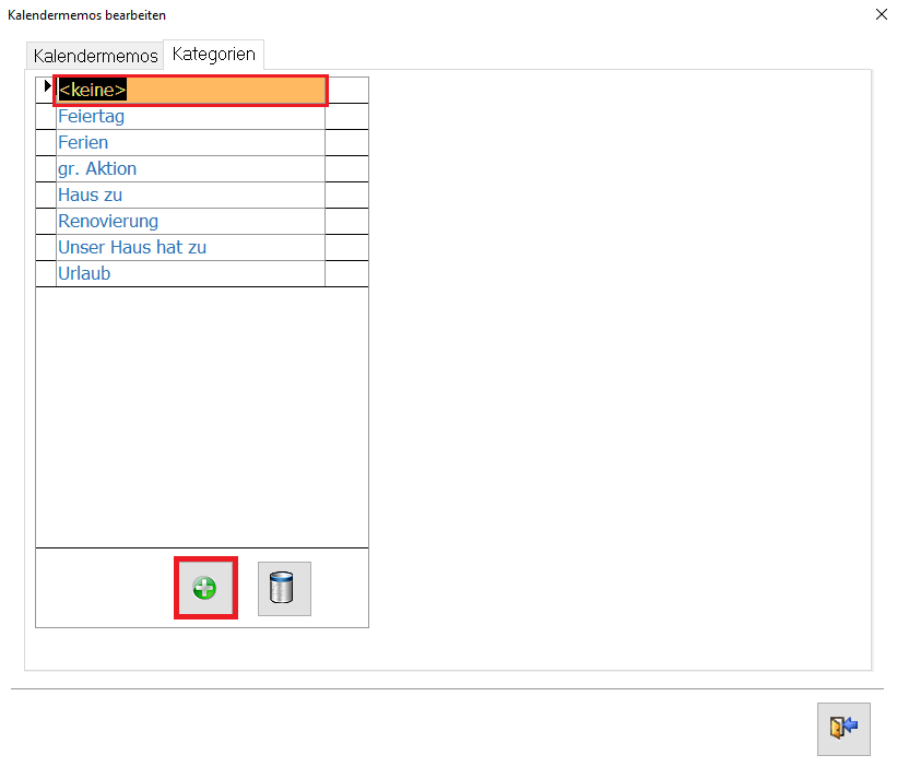 Daraufhin öffnet sich die Maske „Kalendermemos bearbeiten“. Hier können Sie über das grüne Plus-Symbol ein neues Kalendermemo anlegen.