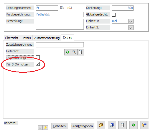Das Häkchen für den „Für B.OA nutzen“ kann im Leistungsstamm bei einer Leistung unter dem Reiter „Extras“ gefunden werden. Auch die Zusatzleistungen werden bei Betätigen der Aktualisierung von BELEGUNG.OnlineAnfragen aktualisiert und auf der Internetseite angezeigt. Dabei werden alle Leistungen inklusive Preiskategorie hochgeladen, deren Preiskategorie nicht gelöscht oder ausgeblendet ist.