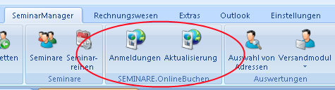 Bei Nutzung des Moduls SEMINARE.OnlineBuchen finden Sie im Menü unter „SeminarManager“ die Schalter „Anmeldung“ und „Aktualisierung”. Der Schalter „Aktualisierung“ führt zwei Aktionen durch: