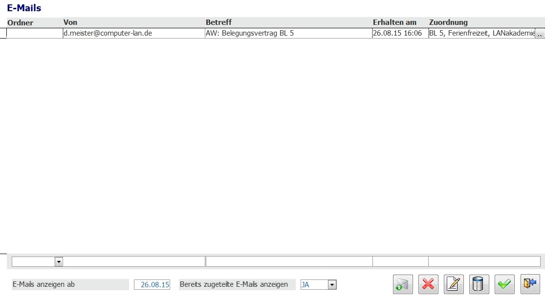 Nach der Hinterlegung der Postfächer können die E-Mails über den Schalter mit dem Brief-Symbol eingelesen werden. Links neben dem Schalter lässt sich über das Datumsfeld „E-Mails anzeigen ab“ einstellen, wie viele E-Mails aus der Vergangenheit eingelesen werden sollten. Außerdem kann definiert werden, ob bereits im Haus- und SeminarManager zugeordnete Mails erneut angezeigt werden sollen.