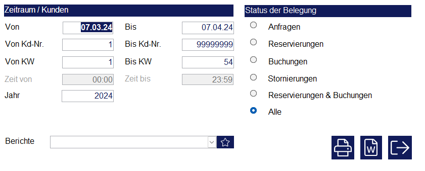 Außerdem haben Sie die Möglichkeit an dieser Stelle verschiedene System-Berichte abzurufen. Diese greifen dann auf unterschiedliche Informationen zurück, welche Sie hier eingeben können. Zum Beispiel verwendet der Bericht Küche Stärkenmeldung die eingetragenen Kalenderwochen. Die eingetragene Kundennummer hat wiederum keine Auswirkung auf den Bericht. Für den Bericht Raumbelegungsplan ist jedoch die eingetragene Kundennummer entscheidend - die Kalenderwoche nicht. Sollten Sie die Berichte aber unabhängig von bestimmten Daten öffnen möchten, tragen Sie beispielsweise bei der Kundennummer 1 bis 99999999 ein. Oder bei der Kalenderwoche 1 bis 54. Zudem können Sie auf der rechten Seite auch festlegen, welche Belegungen Ihnen angezeigt werden sollen - nur die Anfragen, nur die Reservierungen, usw.