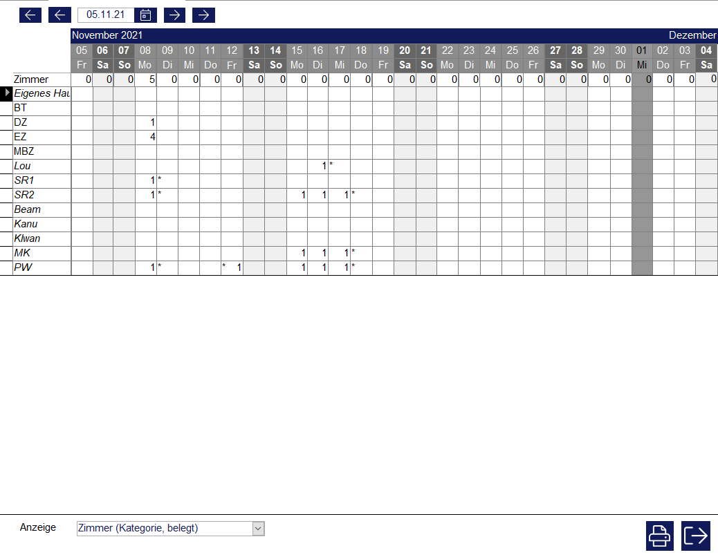 Über die Maske „Freie und Belegte Zimmer“ sehen Sie Ihre freien bzw. belegten Ressourcen je Kategorie in einer monatlichen Übersicht. Auf der linken Seite sehen Sie hierbei von oben nach unten die von Ihnen im Ressourcenstamm definierten Zimmer-, Raum-, und Technikkategorien. Die Bedeutung der einzelnen Zahlen hängt dabei von der gewählten Anzeigevariante ab.