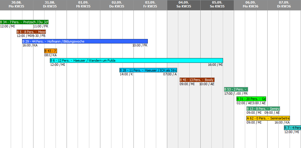 Der Zeitplan gibt Ihnen eine kalendarische und grafische Übersicht Ihrer Belegungen und Seminare. Die einzelnen Kalendertage werden hierbei spaltenweise dargestellt. Die farbigen Balken im eigentlichen Anzeigebereich stellen hierbei entweder Ihre Belegungen oder Seminare dar. Die angezeigten Informationen pro Gruppe bzw. Gast können hierbei in den Programmeinstellungen individuell festgelegt werden. Sie haben also eine Übersicht, welche Gäste von wann bis wann mit welchen Details in Ihrer Einrichtung anwesend sind.