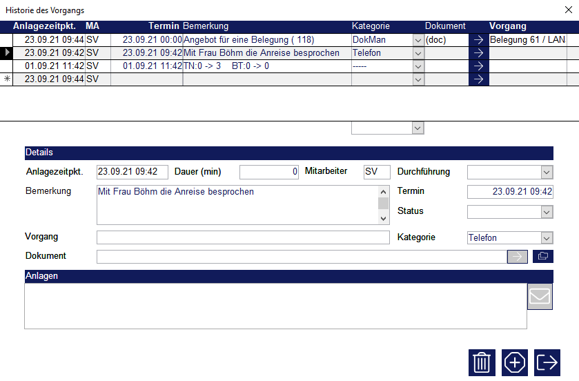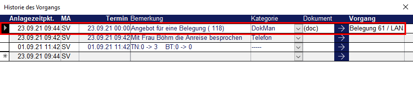 Öffnen Sie die Historie in einer Belegung, um einzusehen, wie der Stand der Bearbeitung ist oder um eine neue Gesprächsnotiz einzutragen.