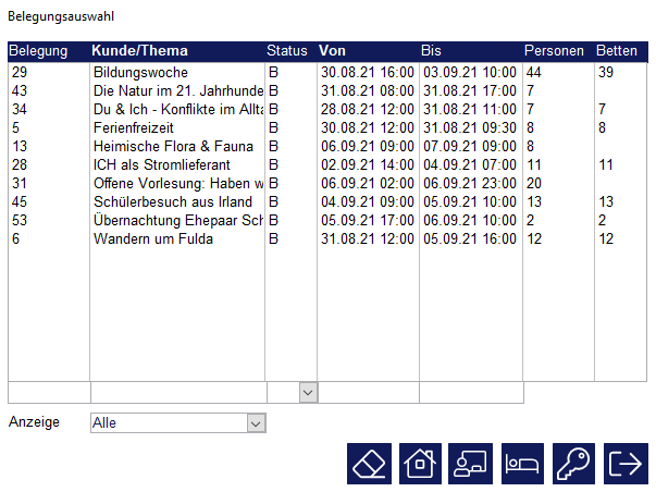 In der Liste ist außerdem leicht zu erkennen, ob für jeden Teilnehmer auch ein Bett vergeben wurde. Vergleichen Sie dazu die beiden Spalten „Personen“ (Anzahl Personen in der Belegung) und „Betten“ (Anzahl der zugeteilten Betten).