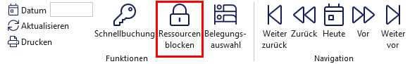 Im Ressourcenplan können auch Blockungen eingegeben werden, ohne dass es dazu eine Belegung/ein Seminar gibt. Z. B. soll ein Raum für eine Besprechung oder ein Zimmer aufgrund einer Renovierung geblockt werden. Klicken Sie dazu im Menü auf „Ressourcen blocken“.