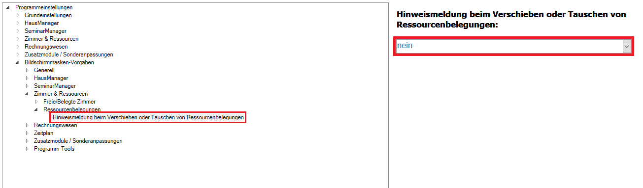 Sie haben die Möglichkeit, beim Verschieben bzw. Tauschen von Ressourcenbelegungen eine Hinweismeldung erscheinen zu lassen. Diese Einstellung können Sie über den Menüpunkt „Programmeinstellungen“ > „Bildschirmmasken-Vorgaben“ > „Zimmer & Ressourcen“ > „Ressourcenbelegungen“ aufrufen.
