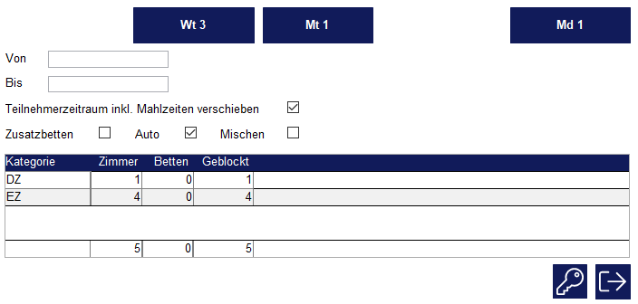 Das Blocken von Zimmern funktioniert genau wie die Zimmerzuteilung. Allerdings ist es nicht notwendig, Teilnehmer auszuwählen. Stattdessen wird einfach die Anzahl der Betten eingegeben, die geblockt werden soll.