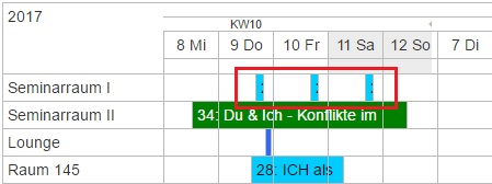 Bei der Zuteilung kann außerdem zwischen der Einstellung „Durchgehend“ und „jeden x-ten Tag“ unterschieden werden, Standard ist „Durchgehend“. Wenn ein Seminarraum von einer Gruppe nur morgens belegt wird und nachmittags wieder zur Verfügung steht, so wählen Sie die Einstellung „jeden x-ten Tag“ aus. Geben Sie das Intervall an (jeden Tag, jeden zweiten Tag, …) und eine Uhrzeit für die Raumbelegung. Bei der Zuteilung des Raums werden mehrere Raumzuteilungen, also mehrere farbige Balken auf dem Ressourcenplan, angelegt. Jede Raumzuteilung kann in der Folge gesondert bearbeitet oder gelöscht werden.