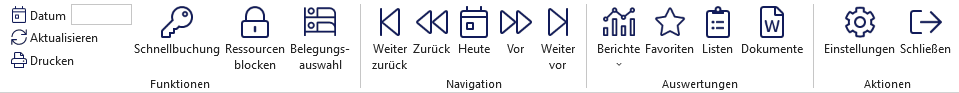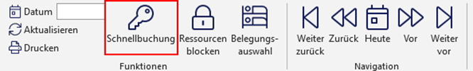 Die Funktion „Schnellbuchung“ ist im Menü des Ressourcenplans zu finden. Hierüber werden Belegungen direkt im Ressourcenplan angelegt und gewünschte Zimmer zugeteilt.