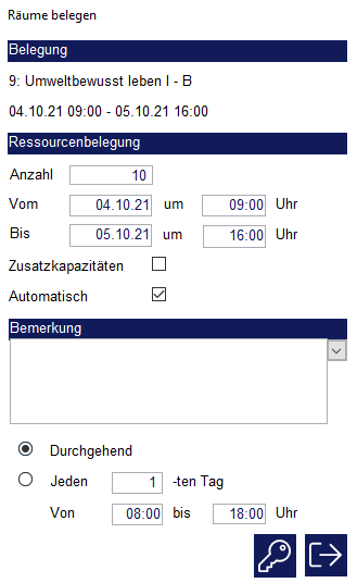Auf der Maske kann zunächst der Belegungszeitraum des Raums/der Technik eingegeben werden. Standardmäßig steht dort zunächst der Zeitraum der Belegung/des Seminars. Unter „Bemerkung“ werden Informationen zu der Raumbelegung hinterlegt, z. B. für den Hausmeister („Stühle stellen, …“). Diese Bemerkungen können nach der Zuteilung über einen Rechtsklick darauf > „Ändern“ bearbeitet werden.