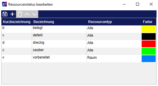 Weiterhin kann in der Spalte „Ressourcentyp“ festgelegt werden, dass ein Status NUR für Zimmer oder NUR für Räume gilt. Die vordefinierte Auswahl „Alle“ gibt an, dass der Status für jede Ressource vergeben werden kann.