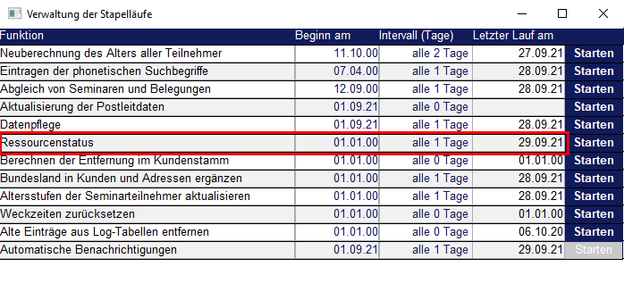 Setzen Sie nun in der Zeile „Ressourcenstatus“ das Intervall auf „alle 1 Tage“, damit der Ressourcenstatus täglich aktualisiert wird. Der Stapellauf wird bei Nutzung eines Servers jede Nacht ausgeführt. Sollten Sie eine Einzelplatz-Version nutzen, werden Sie beim Start des Programms aufgefordert, die Stapelläufe durchzuführen.