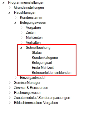 Für eine Schnellbuchung werden einige Werte vorbelegt. Wechseln Sie in die Programmeinstellungen (im Menü unter „Einstellungen“ > „Grundlagen“). Öffnen Sie dort „HausManager“ > „Belegungswesen“ > „Schnellbuchung“ und passen Sie die folgenden Einstellungen an.