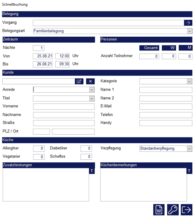 • Belegungsart: Mit dieser Belegungsart wird die Schnellbuchung angelegt. Dies kann auf der Maske „Schnellbuchung“ noch geändert werden.