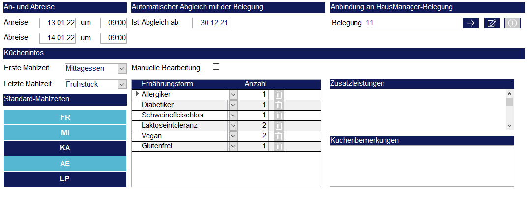Sie können die Verpflegung einstellen, indem Sie zunächst die benötigten Standard-Mahlzeiten anklicken. Ein aktivierter Schalter wird hellblau hinterlegt. Anhand der Standard-Mahlzeiten und der An- und Abreise wird die erste und letzte Mahlzeit eingetragen. Außerdem können Küchenbemerkungen zu dem Seminar hinterlegt werden. Klicken Sie abschließend unter „Anbindung an HausManager-Belegung“ auf den Plusschalter, um eine Belegung gemäß den von Ihnen getätigten Vorgaben anzulegen. Danach ist der Plusschalter inaktiv und die Belegungsnummer wird angezeigt.