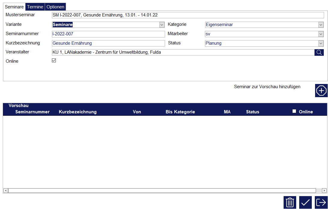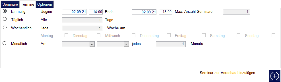 Der Klick auf den Schalter „Seminar zur Vorschau hinzufügen“ legt alle Termine an, die nach den unter „Termine“ eingegebenen Kriterien möglich sind. Hierbei kann es sich um einen oder mehrere Termine handeln.