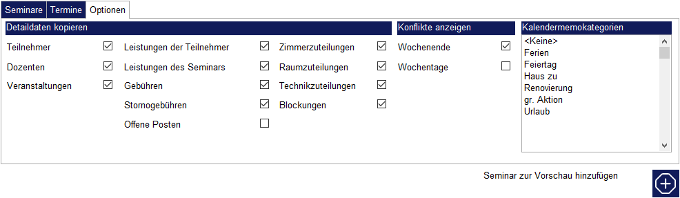 Im rechten Bereich namens „Konflikte anzeigen“ kann eingestellt werden, in welchem Fall der SeminarManager eine Zeitraumwarnung anzeigen soll. Liegt ein neuer Seminartermin voraussichtlich am Wochenende? Überschneidet sich der Termin mit einem Kalendermemo (z. B. „Renovierung“ oder „Feiertag“)?