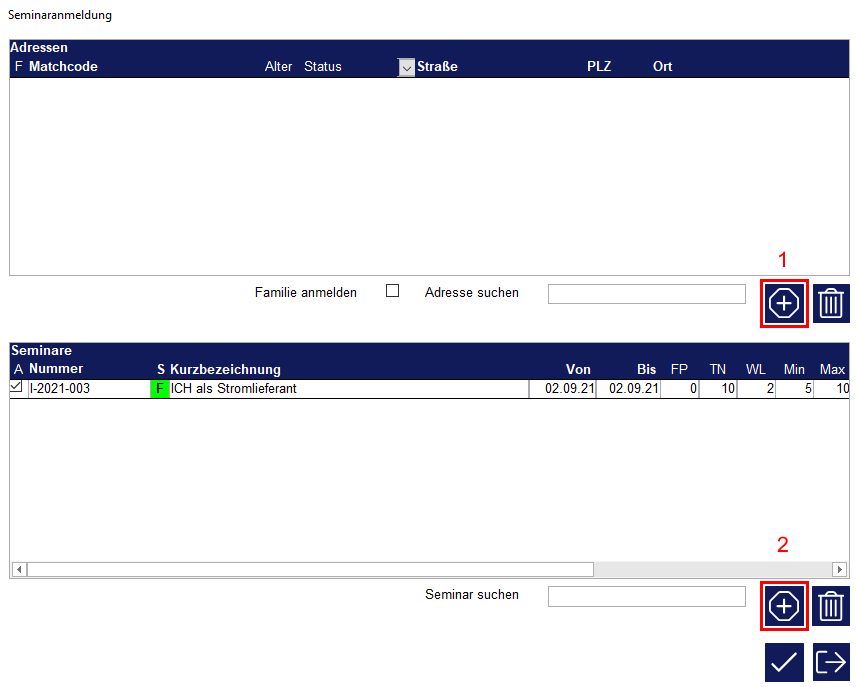 Es öffnet sich eine neue Maske „Seminaranmeldung“. Hierüber können beliebige Adressen einem oder auch mehreren Seminaren zugordnet werden. Zum Suchen einer Adresse hinterlegen Sie im Eingabefeld „Adresse suchen:“ den entsprechenden Suchbegriff, beispielsweise den Namen der Person, und rufen die Suche über den Plusschalter (1) auf. Über den Plusschalter (2) können Sie nach weiteren Seminaren suchen, um die Personen gleich mehreren Seminaren zuzuordnen.