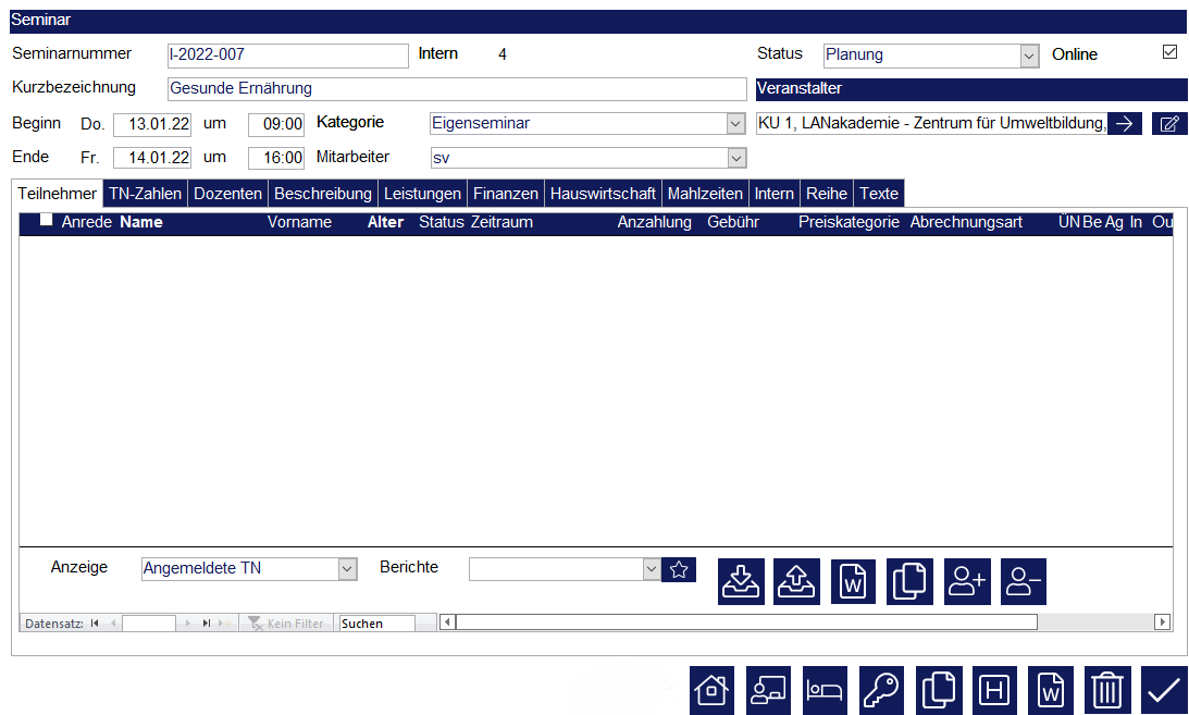 Nach dem Öffnen bzw. Anlegen eines Seminars ist automatisch der erste Karteireiter „Teilnehmer“ ausgewählt.