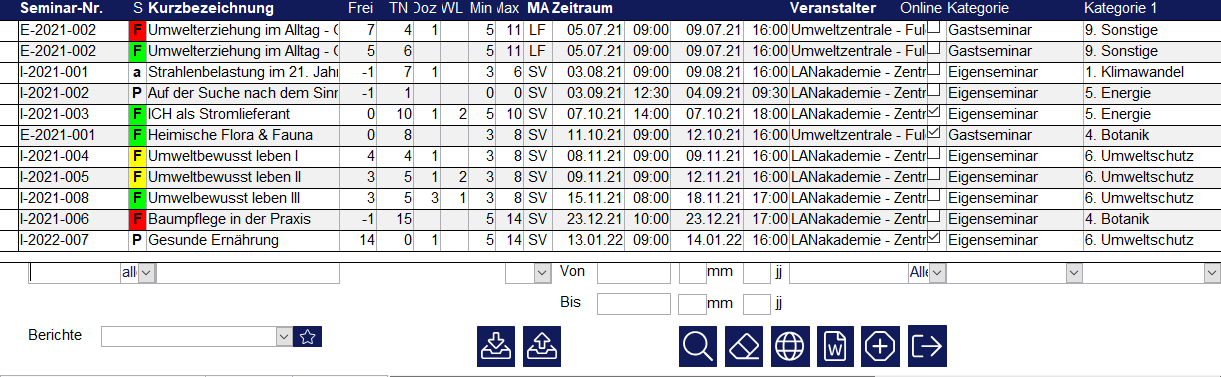 Sie sehen eine Tabelle mit allen Seminaren. In den Spalten von links nach rechts finden Sie zu jedem Seminar die folgenden Informationen: