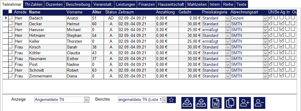 In der Teilnehmerliste ist außerdem ersichtlich, welche Anzahlung, Gebühr, Preiskategorie oder Abrechnungsart pro Teilnehmer eingestellt ist. Diese Felder werden beim Thema „Rechnungswesen“ genauer erklärt.