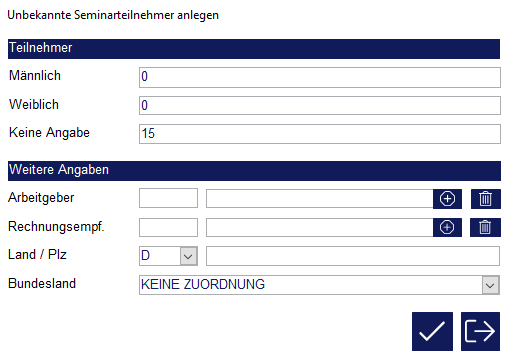 Für unbekannte Teilnehmer kann außerdem ein Geschlecht und ein Herkunftsort hinterlegt werden. Außerdem ist die Zuornung eines Arbeitgebers bzw. Rechnungsempfängers möglich. Diese Eingaben sind sinnvoll, wenn Sie zu den Teilnahmen i. d. R. keine weiteren persönlichen Daten erhalten. Die Teilnahmen werden dann statistisch nach Geschlecht und Herkunft getrennt. Bei Abrechnung werden die Leistungen automatisch dem Rechnungsempfänger in Rechnung gestellt.