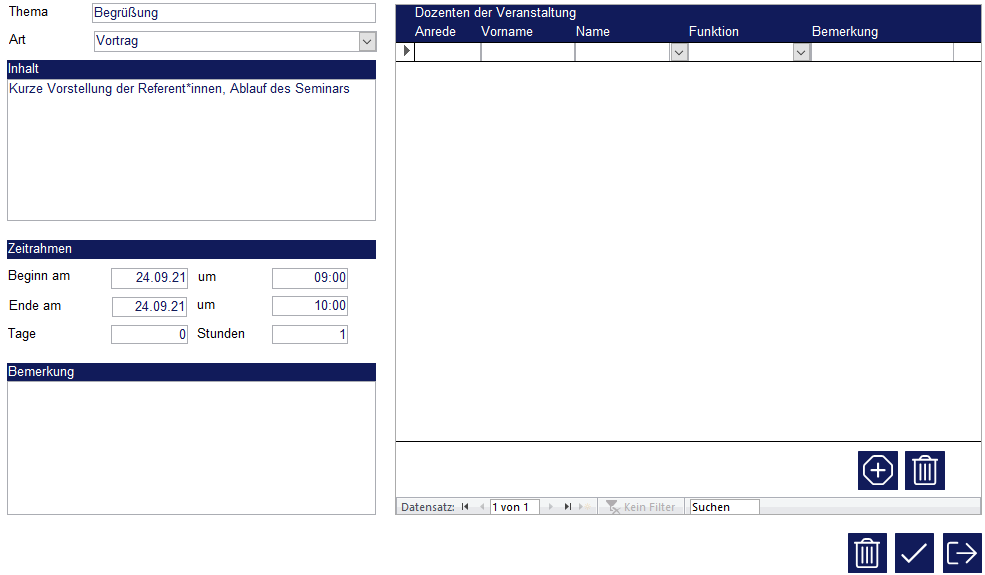 Alle eingegebenen Daten können zu einem späteren Zeitpunkt wieder geändert werden. Bestätigen Sie Ihre Eingaben mit einem Klick auf das Häkchen, damit das Seminar angelegt wird. Danach öffnet sich die Maske „Seminar“.