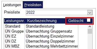 Sie können gelöschte Preiskategorien wieder einblenden, indem Sie im Leistungsstamm das Feld „gelöscht“ aktivieren. Dadurch werden nicht nur die gelöschten Leistungen sichtbar, sondern auch die gelöschten Preiskategorien in einer Leistung. Dort entfernen Sie dann das Häkchen bei „Ausgeblendet“.