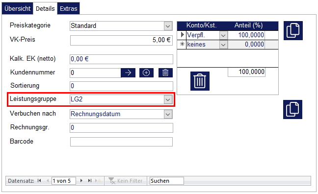 Danach muss der Leistungsstamm evtl. neu aufgerufen werden, damit die Änderungen gespeichert sind. Anschließend kann über die Karteikarte „Details“ bei den entsprechenden Leistungen die Leistungsgruppe hinterlegt werden.