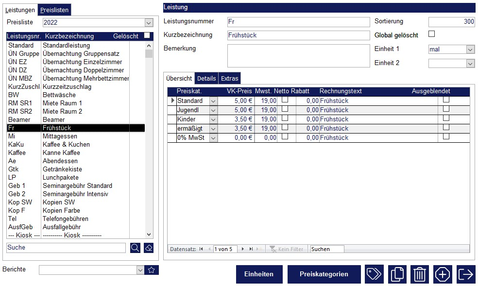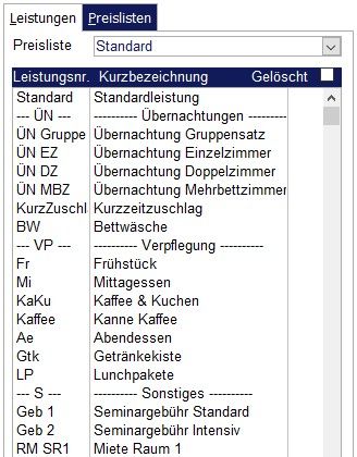 Alle Leistungen, die Sie ihren Kunden in Rechnung stellen möchten, müssen zunächst im Programm hinterlegt werden. Das können z. B. Übernachtungspreise, Mahlzeiten, Kopien, Gebühren, Raummieten usw. sein. Jede Einrichtung bietet seinen Kunden unterschiedlichste Leistungen an. Die Preisstruktur kann von verschiedenen Faktoren abhängen. So kann der Preis oder auch der Mehrwertsteuersatz für ein Frühstück abhängig von der Altersstruktur (Kinder, Jugendliche, Erwachsene) oder von einer Mitgliedschaft (kirchliche Gruppe, nichtkirchliche Gruppe, vhs, …) sein.